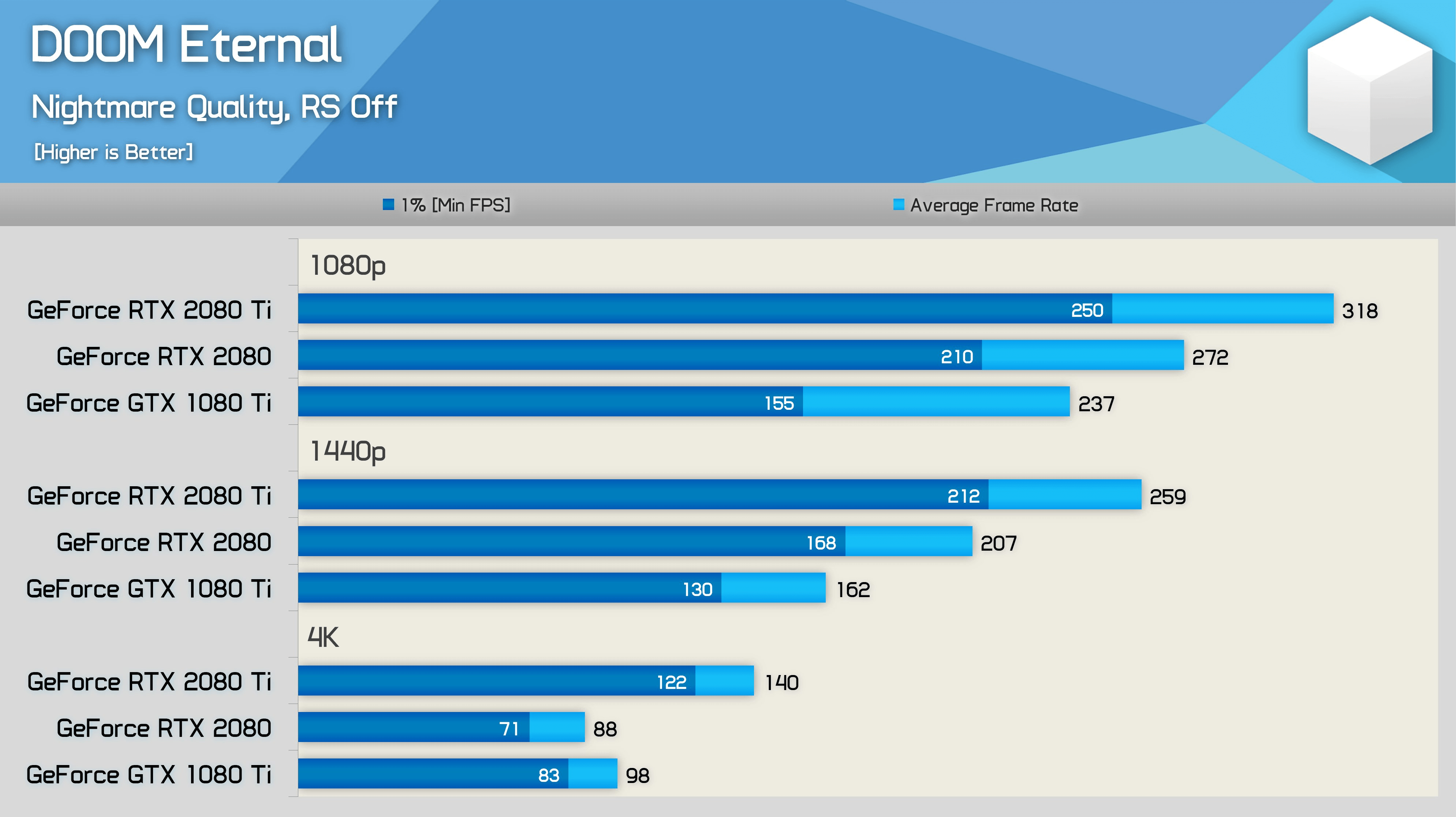 Doom eternal tested on the rx 5700xt at 1920x1080 2560x1440 and 3840x2160 resolutions.